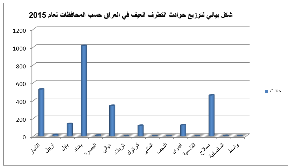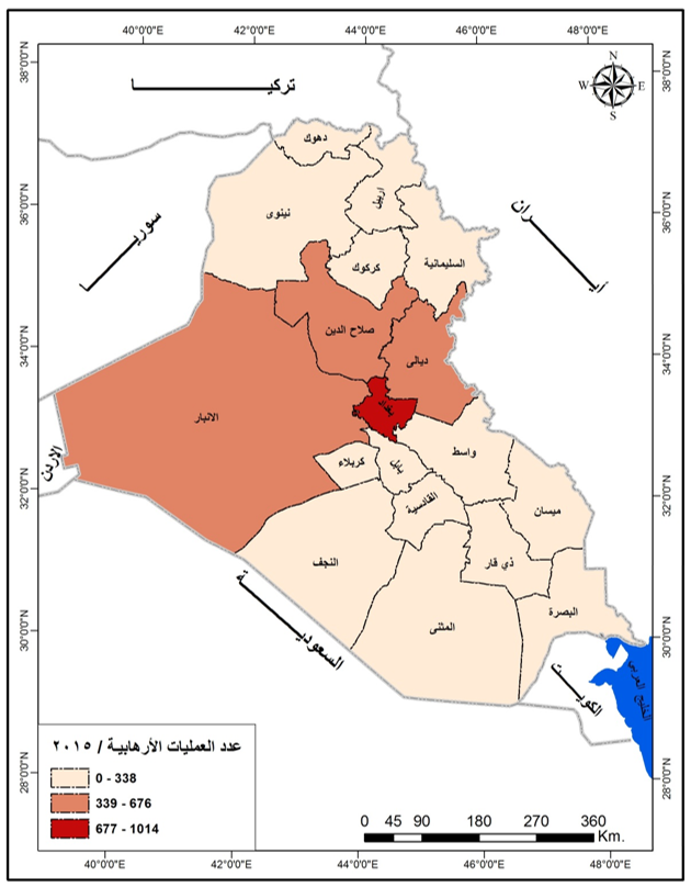 إذ بلغ عدد الحوادث الإرهابية لهذا العام (2751) حادثاً تباينت في توزيعها الجغرافي بحسب المحافظات وبالشكل الآتي: (المثنى، القادسية، النجف، واسط، كربلاء، السليمانية، البصرة، أربيل، كركوك، نينوى، بابل، ديالى، صلاح الدين، الأنبار، بغداد) بعدد عمليات إرهابية بلغت في كل منها (1 ،1 ،1 ،2 ،2 ،3 ،7 ،14 ،117 ،122 ،137، 341 ،524،457، 1014) حادثاً إرهابياً لكل منها على التوالي.