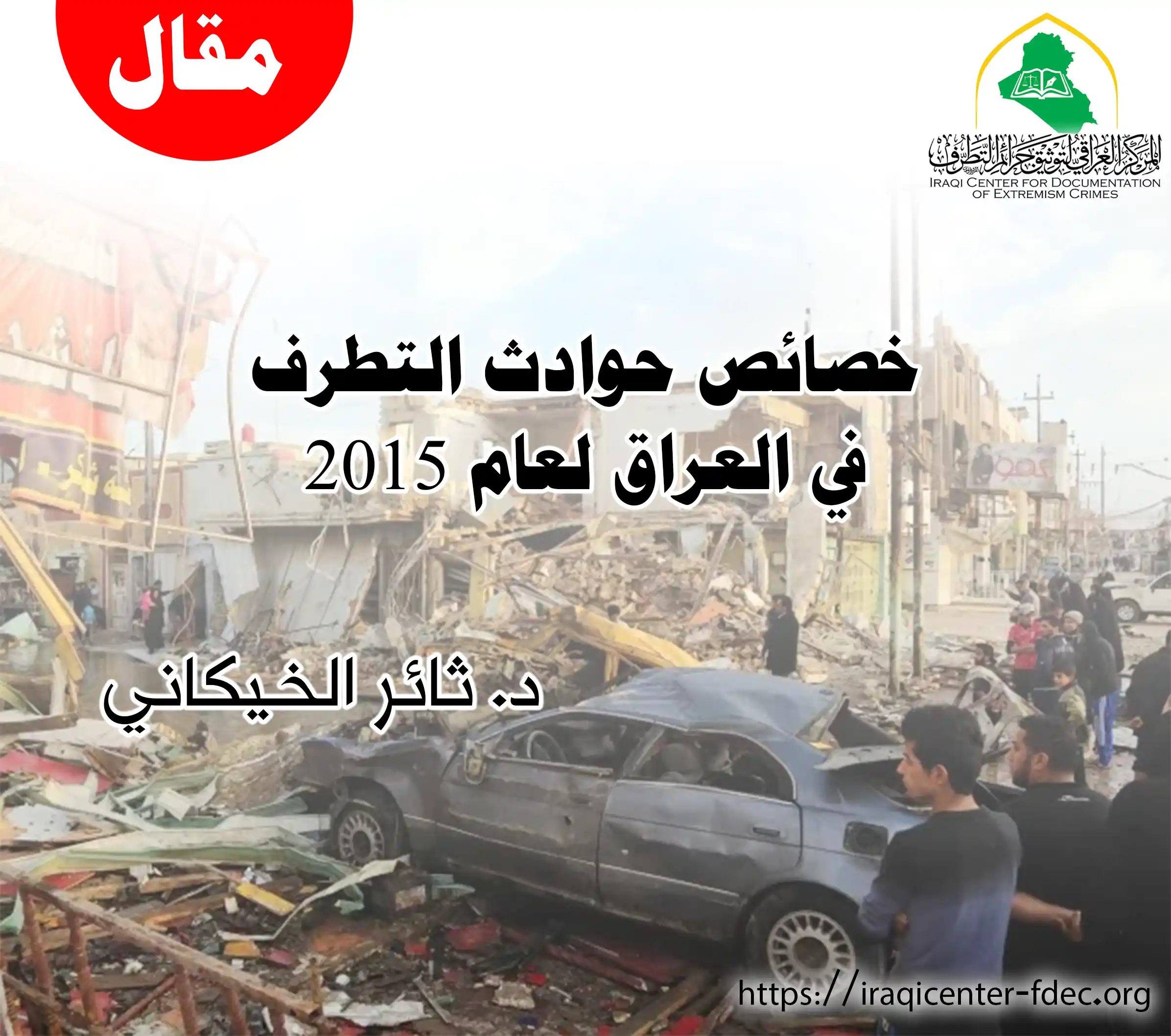 شهد العراق خلال عام 2015م مرحلة معقدة من ظاهرة الإرهاب، ارتبطت بشكل مباشر بتمدد كيان داعش الإرهابي وسيطرته على مساحات واسعة من الأراضي منذ منتصف 2014م، واستمرار المواجهة العسكرية والأمنية لاستعادة المدن، وقد ارتكبت العصابات الإرهابية العديد من الجرائم نذكر منها على سبيل المثال: أقدمت عصابات داعش على محاصرة قبيلة البو نمر وارتكاب مذبحة جماعية بحق أفراد تلك القبيلة؛ بسبب معارضتها لداعش؛ مما أدى إلى استشهاد المئات بينهم أطفال ونساء، وإعدام الشهيد (مصطفى العذاري) شنقا من على أحد الجسور في مدينة الفلوجة أمام تجمع من المواطنين، على الرغم من وقوعه أسيراً بين أيديهم، في سابقة بعيدة عن تعاليم الأديان السماوية وقيم الإنسانية جمعاء، وجريمة إحراق (4) من أفرد الحشد الشعبي في سلوك همجي لا يفرق بين البشر والحيوان والجماد، ولا يفرق بين مكونات الشعب العراقي على اختلاف دياناتهم ومذاهبهم وقومياتهم، وقامت تلك العصابات بنشر طريقة الإعدام من خلال وسائل التواصل الاجتماعي، فضلاً عن تفجير سوق شعبي مزدحم في منطقة علوة جميلة في محافظة بغداد يوم 13 آب 2015، بواسطة سيارة حمل مفخخة، تسبب التفجير باستشهاد (80) شخصاً، وإصابة أكثر من (200) آخرين بجروح متعددة، فضلاً عن تفجير أحد الأسواق الشعبيَّة في مدينة خان بني سعد في محافظة ديالى بالتزامن مع حلول العيد فنتج عن التفجير أكثر من (120) شهيداً و(116) جريحًا.