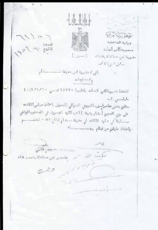 الوثيقة المرفقة ربطاً صادرة من مديرية أمن بغداد ومعنونه إلى مديرية أمن مدينة صدام (الصدر حاليًا) تحمل العدد 61456 بتاريخ 20/8/1984، جاءت تحت عنوان معلومات، ويبدو انها جاءت بناءً على كتاب سابق من مديرية الامن العامة الى مديرية امن محافظة بغداد تحمل الرقم 65220 في 20/9/1984، وهذا الكتاب يبين ان هناك من ينوي إقامة مجلس الفاتحة على روح احد المعدومين وهو بشار رشيد اللاعب العراقي المعروف في المنتخب الوطني، وذكرت الوثيقة بالتفصيل عنوان داره الكائنة في مدينة صدام قطاع (52)، وفي أعراف نظام البعث ان مجلس العزاء يُعد جريمة، فالمعدوم لا يُقام له مأتم، ولا يُسمح لأهله بالبكاء أو العويل بصوت مسموع يسمعه الجيران، وأحياناً يُدفن سراً بدون حضور الاهل، وفي كثير من الحالات لا يُسلَّم الجثمان لذويه أصلًا.