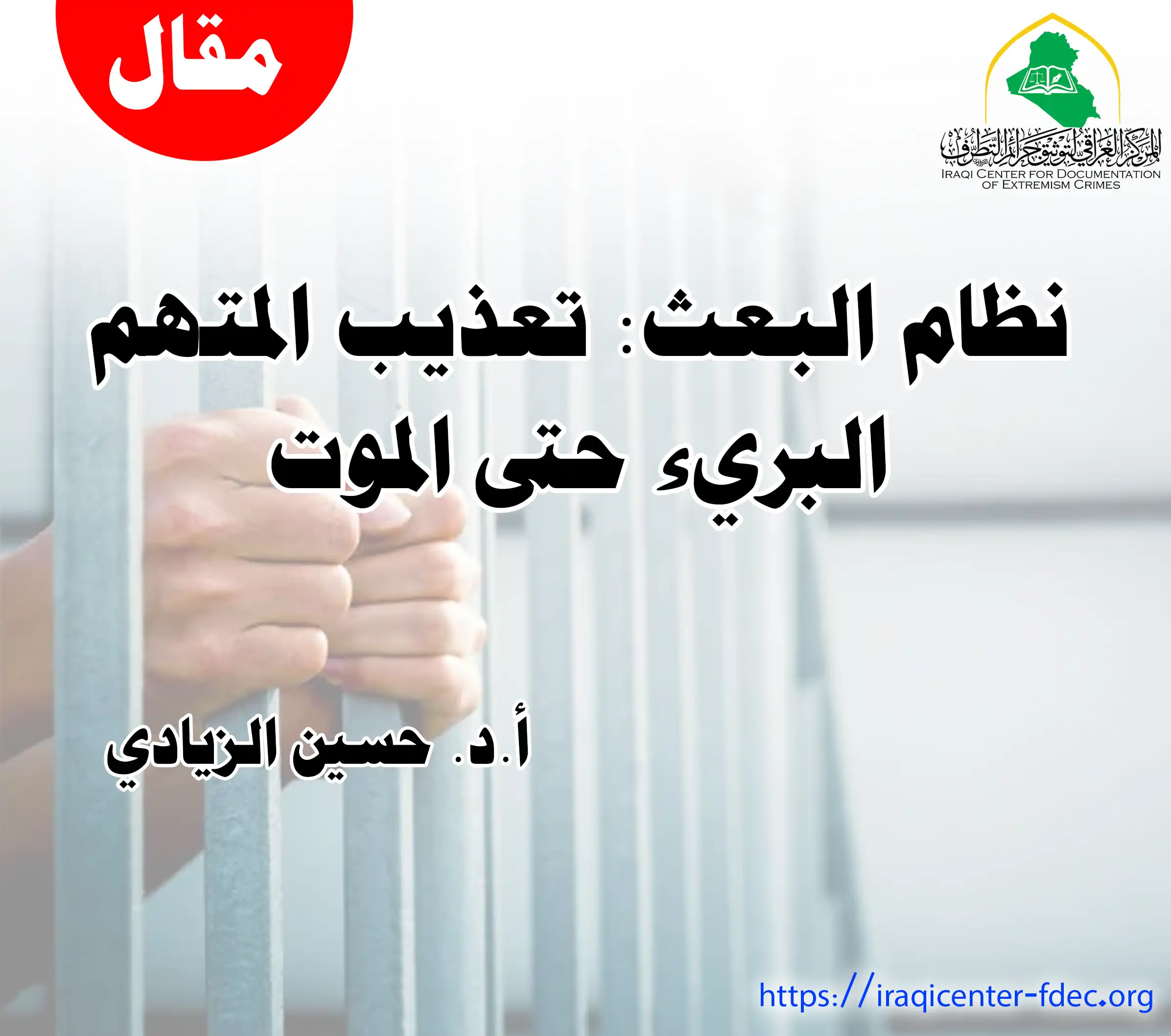 يُعَرّف التعذيب بحسب القانون الدولي على أنه اي فعل مقصود يراد منه إلحاق ألماً بمواطن ما، سواء كان هذا الألم جسدياً أم نفسياً، بغرض انتزاع معلومات، أو الحصول على اعترافات، أو معاقبة المواطن على سلوك معين وتصرف ما، ويشترط هذا التعريف أن يتم الفعل من قِبل موظف رسمي أو بموافقته أو رضاه؛ مما يُضفي على الجريمة صفة الرسمية، وهذا الأمر واضح وجلي في عمليات التعذيب التي مارستها أجهزة نظام البعث فهي أجهزة رسمية تأسست على وفق أنظمة وقرارات صادرة من أعلى المستويات، وجاءت أفعالها برضا أصحاب القرار ومباركتهم، بل بتوجيه مباشر وملزم من قبلهم، وقد ورد هذا التعريف بصيغته الأكثر دقة في المادة الأولى من اتفاقية مناهضة التعذيب لعام 1984، وهو ما شكل لاحقًا الإطار المرجعي الأساسي في جميع التشريعات الدولية والوطنية ذات الصلة.