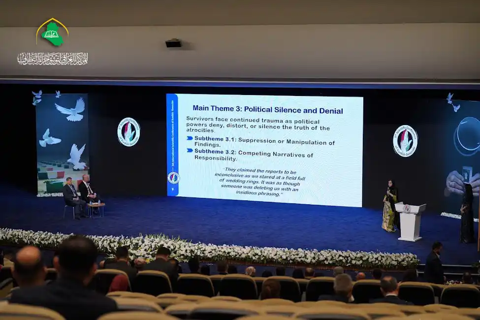 وحضر وفد المركز العراقي المتمثل بالأستاذ المساعد الدكتور رائد عبيس والدكتور ثائر غالب فعاليات المؤتمر الذي حمل شعار: «التوثيق العلمي لجرائم الأنفال والمقابر الجماعية: نحو الاعتراف الدولي بإبادة الشعب الكوردي»، والمنعقد في مركز المؤتمرات بجامعة دهوك للمدة من 28 – 29 تشرين الأول 2025.