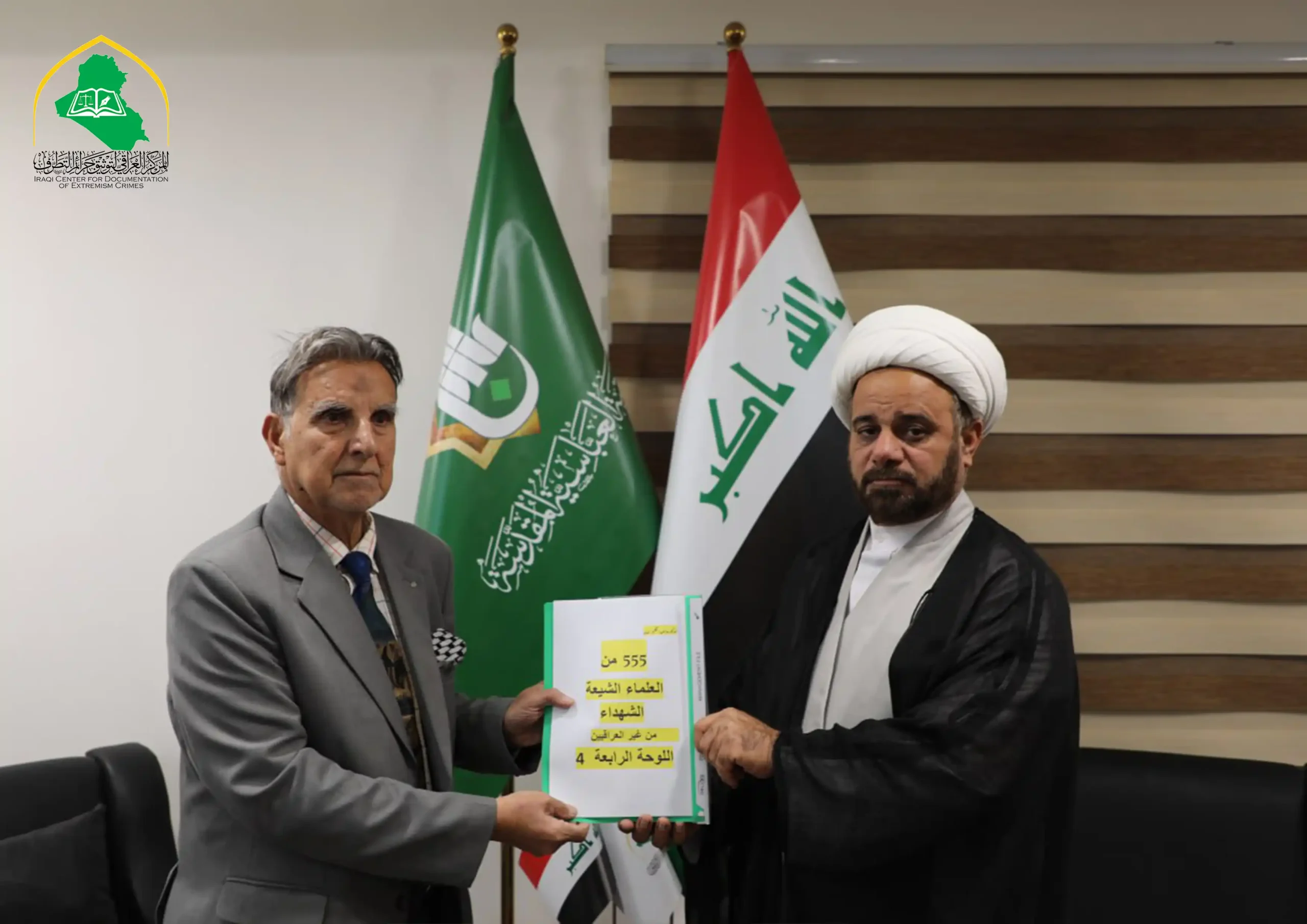 ضمن سلسلةِ أعمالهِ التوثيقية، وأرشيفه الخاص بجرائم وانتهاكات نظام البعث، أهدى سفيرُ السلام العالمي الدكتور صاحب الحكيم المركزَ العراقي لتوثيق جرائم التطرُّفِ لوحةً حملتْ صورًا لـ (555) شخصيةً علمائيةً شيعيَّةً من غير العراقيين، مع سجل يوثِّقُ ذلك، كان قد قتلهم نظامُ البعث في العراق ضمن حملته الظالمة ضد الحوزة العلمية وطلابها وأساتذتها وخطبائها. وكان نظام البعث قدْ شنَّ حملاتِ تسفيرٍ واسعةً لعشرات الآلاف من الطلبة وعوائلهم تحت ذريعة “التبعية” في سبعينيات القرن الماضي، واستمرَّت هذه الجرائم في مدد عديدة من حكم البعث حتى سقوطه في 2003، فيما قَتَلَ كثيراً من علماء الحوزة العلمية وطلبتها، وزجَّ بالآلاف منهم في السجون ظلمًا وعدوانًا. وعلَّق الدكتور صاحب الحكيم على اللوحة بالقول: ((لا توجدُ طائفة في العالم -بحسب استقرائي وتتبُّعي- قُتِلَ منها هذا العدد الكبير كما حصل لعلماء الشيعة وطلبة الحوزة على يد نظام البعث!)). وتأتي هذه الأعمال ضمن برامج يقوم بها المركز العراقي لتوثيق جرائم التطرُّف في جمع ودراسة الوثائق التي تُدين نظام البعث وتفضح جرائمه، وتحفظ الذاكرة التاريخية من التلاعب والتزوير.