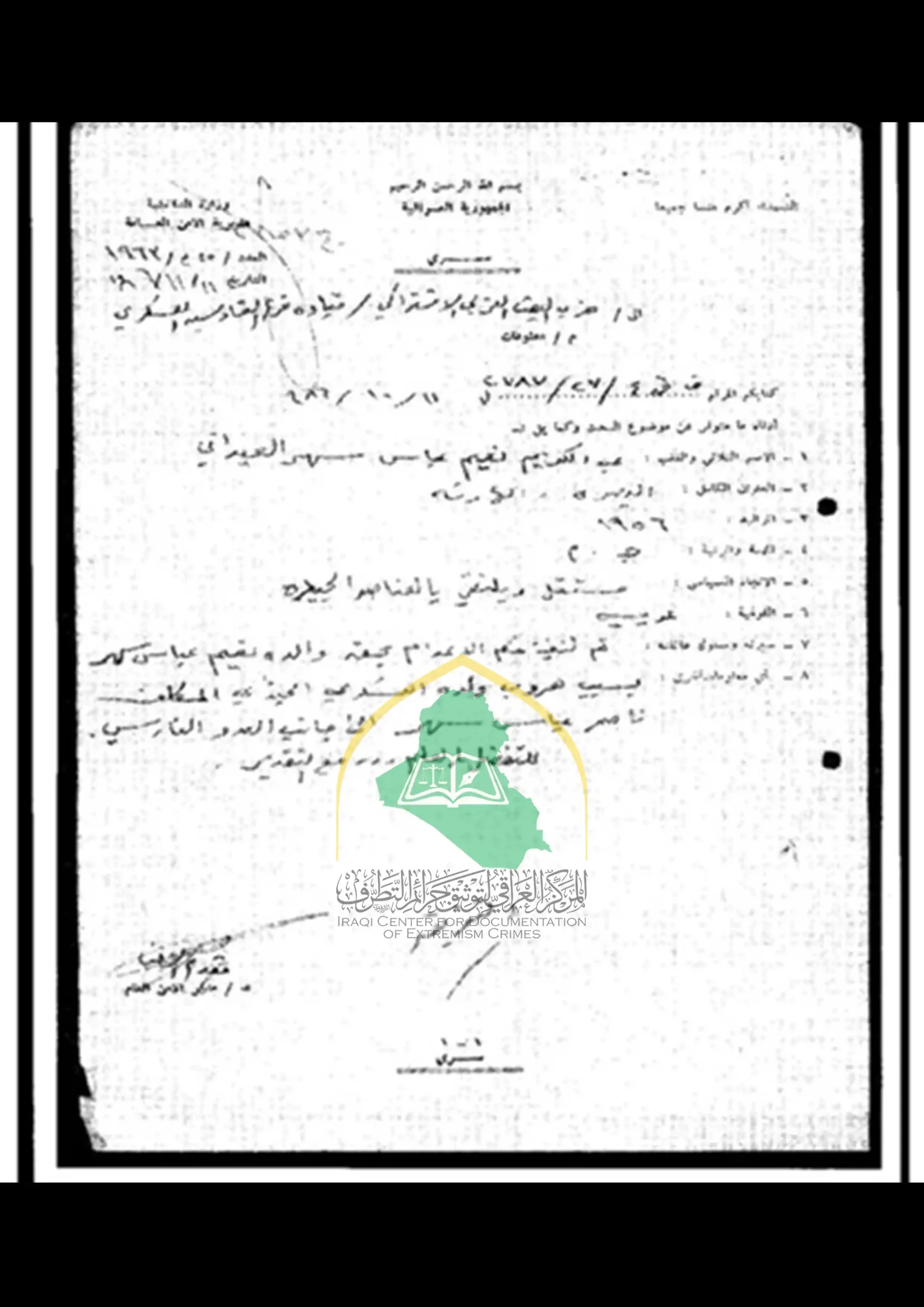 الوثيقة السرية المرفقة ربطاً صادرة من مديرية الأمن العامة إلى قيادة فرع القادسية العسكري، جاءت تحت عنوان معلومات، تحمل العدد 45/ 1963 بتاريخ 11/11/1986، ويبدو أنها جاءت بناءً على كتاب سابق من قيادة فرع القادسية العسكري يحمل الرقم ف ق4/27/2787 في 11/10/1986، ومضمون الوثيقة هي معلومات عن المواطن عبد الكريم نعيم عباس سهر العيداني من سكنة محافظة البصرة/ الهارثة، عمله جندي مكلف، ما يهمنا من متن الوثيقة هي فقرة في غاية الأهمية جاءت بعنوان (معلومات أخرى)، فقد ذكرت الوثيقة أنه تم تنفيذ حكم الإعدام بحق والد نعيم عباس سهر؛ بسبب هروب ولده العسكري الجندي المكلف ناصر عباس سهر إلى جانب العدو.