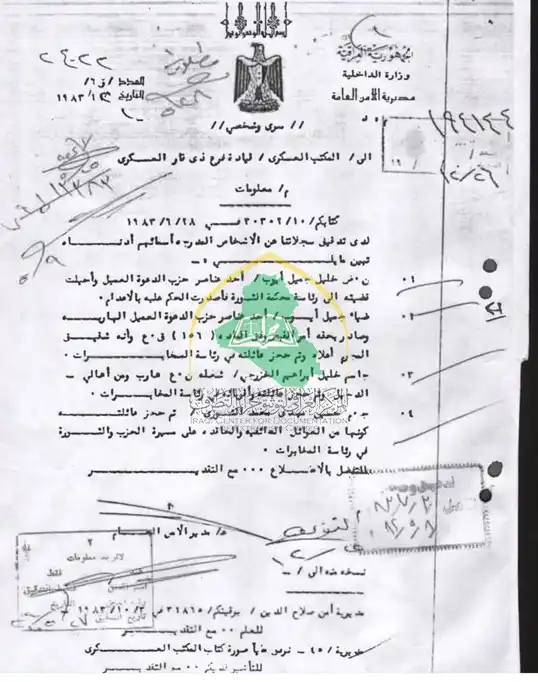 تظهر هذه الوثيقة الصادرة عن مديرية الأمن العامة بتاريخ 10/12/ 1983، والموجهة إلى القيادة العسكرية لفرع ذي قار، بوصفها جهة عسكرية وأمنية تنفيذية جانباً مهماً من آلة القمع، وكيف كان نظام البعث يتعامل مع المواطنين تحت ذريعة – العداء لمسيرة الحزب والثورة – والوثيقة تحمل طابع (سري وشخصي) وتضم قرارات تعسفية طالت عدداً من الأبرياء وعائلاتهم.