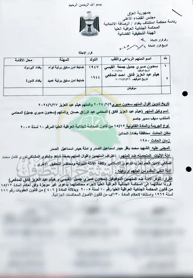 وبحسب مصادر قضائية، تضمّن قرار الإحالة توفّر الأدلة الكافية بحق المتهمين، وبناءً عليه أُحيلا إلى المحكمة الجنائية العراقية العليا لمحاكمتهما بدعوى غير موجزة، استناداً إلى المادة (12/15) من قانون المحكمة الجنائية العراقية العليا، وبدلالة المادة (406) من قانون العقوبات رقم (111) لسنة 1969، وبالاستناد إلى المادة (130/ب) من قانون أصول المحاكمات الجزائية.