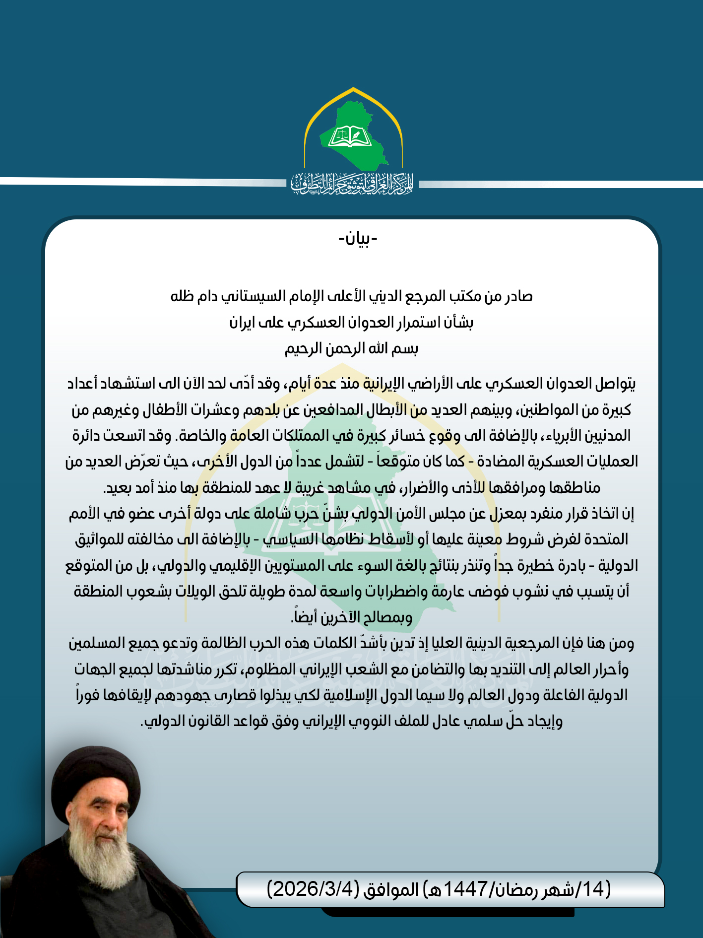 في وقتٍ تتسارع فيه الحروب، وتُختزل فيه القوانين الدولية إلى شعارات انتقائية، يبرز بيان المرجعية الدينية العليا، الصادر عن مكتب سماحة آية الله العظمى علي الحسيني السيستاني، بوصفه موقفاً أخلاقياً وقانونياً صريحاً في إدانة العدوان (الأمريكي – الصهيوني) على الجمهورية الإسلامية الإيرانية، ومرافعة إنسانية في مواجهة منطق القوة والغلبة.