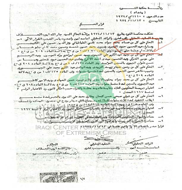 الوثيقة المرفقة ربطاً هي قرار حكم صادر من رئاسة محكمة الثورة، تحمل العدد (1110 / ج / 1974م)، بتاريخ (13) تشرين الثاني 1974م، وذيلت الوثيقة بأسماء هيأة المحكمة التي كانت برئاسة (جار الله أيوب العلاف) وعضوية (العقيد راغب فخري) و (الرائد أسامة أمين)، وتحليل محتوى القرار الإعدام شنقاً حتى الموت بحق قادة قبضة الهدى (الشيخ عارف البصري ورفاقه الأربعة)، وهي عقوبة سياسية بامتياز غُلفت بإطار جنائي شكلي، وتبرز الوثيقة في فقرتها الخامسة محاولة النظام النيل من المكانة الاجتماعية للشهداء عبر اعتبار جريمتهم مخلة بالشرف، وهو قلب لموازين القيم؛ إذ حوّل العمل الرسالي إلى وصمة جنائية ولم يقتصر القرار على الإعدام، بل مصادرة الأموال المنقولة وغير المنقولة (الفقرة 8)؛ مما يظهر نهج النظام في استئصال الوجود المادي والمالي للمعارضين وعوائلهم، والوثيقة تثبت صدور أحكام قطعية بالإعدام في يوم واحد (تاريخ التشكيل هو ذاته تاريخ الحكم)؛ مما يؤكد غياب المرافعة الحقيقية وضمانات الدفاع، وأن الأحكام كانت معدة سلفاً.