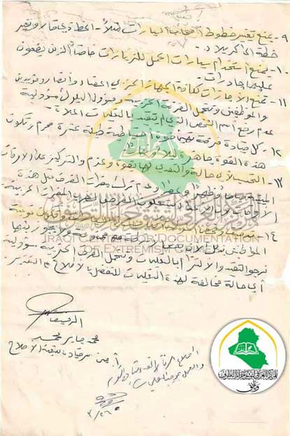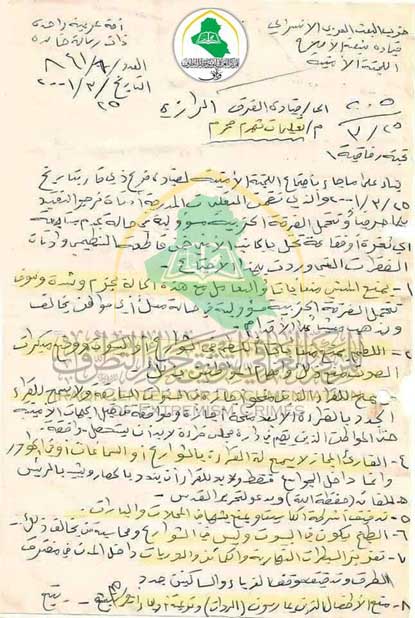بناء على ما جاء باجتماع اللجنة الأمنية لقيادة فرع ذي قار بتاريخ 25/3/ 2001 والذي تضمنت التعليمات المدرجة أدناه نرجو التقيد بها حرفيا وتتحمل الفرقة الحزبية مسؤولية في حالة عدم متابعة أي ثغرة أو فقاعة تحل بالجانب الأمني ضمن قاطعه التنظيم وأدناه الفقرات التي وردت بهذا الاجتماع: