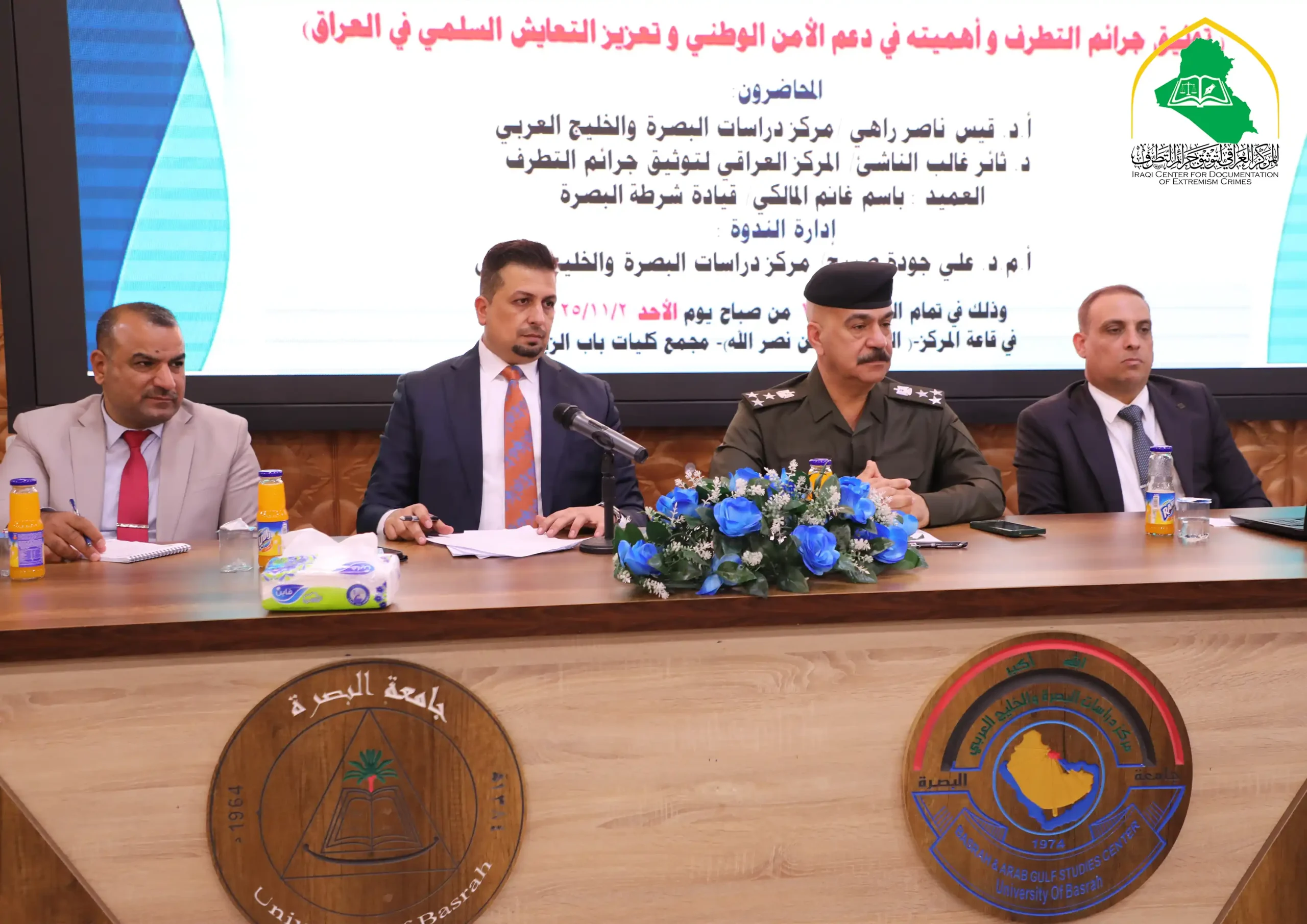 أقام المركزُ العراقيُّ لتوثيق جرائم التطرُّف ندوةً علميَّةً في جامعة البصرة موسومةً بـــ (توثيق جرائم التطرُّف وأهميتُهُ في دعم الأمن الوطني وتعزيز التعايش السلمي ....