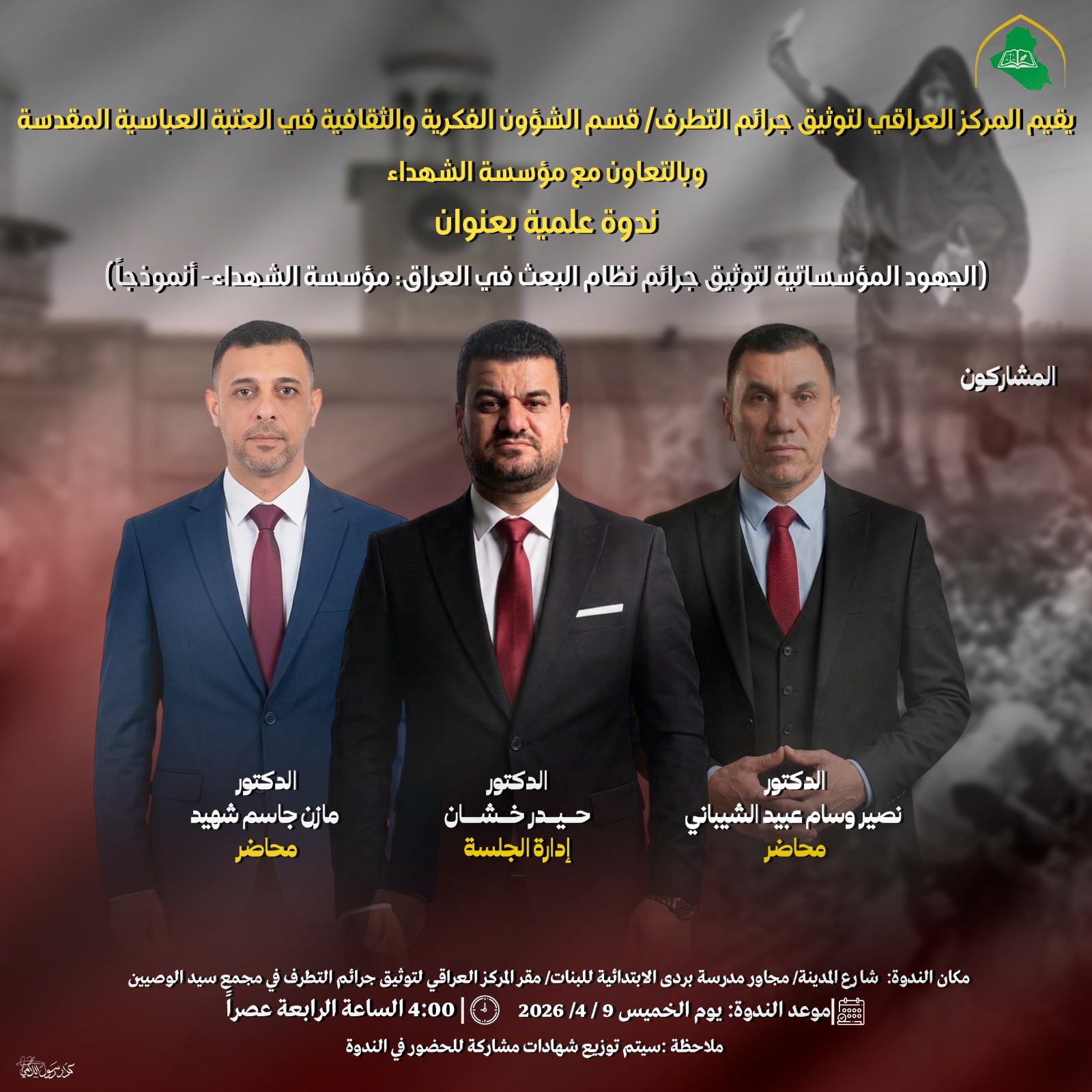 أقام المركز العراقي لتوثيق جرائم التطرف ندوة علمية إلكترونية بعنوان: (استذكار جرائم نظام البعث ضمانة لعدم عودة الأنظمة الاستبدادية)، وذلك في تمام الساعة التاسعة ....