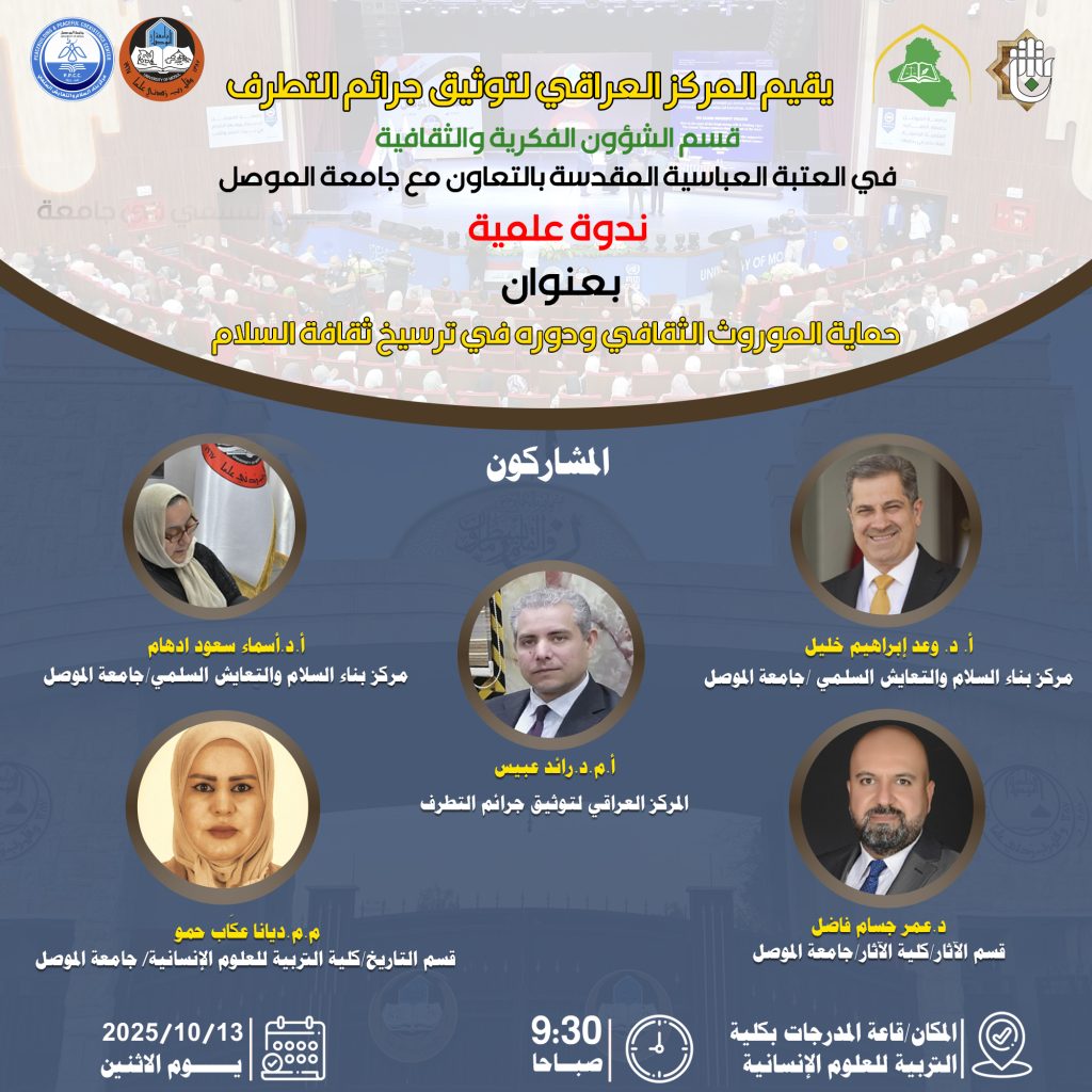 يقيم المركز العراقي لتوثيق جرائم التطرف في قسم الشؤون الفكرية والثقافية بالعتبة العباسية المقدسة بالتعاون مع جامعة الموصل ندوة علمية بعنوان(حماية الموروث الثقافي ودوره في ترسيخ ثقافة السلام)، وذلك في تمام الساعة العاشرة من صباح يوم الاثنين الموافق 13/ ١٠ / ٢٠٢٥ م، في قاعة المدرجات بكلية العلوم الإنسانية في جامعة الموصل. ويشارك في الندوة […]