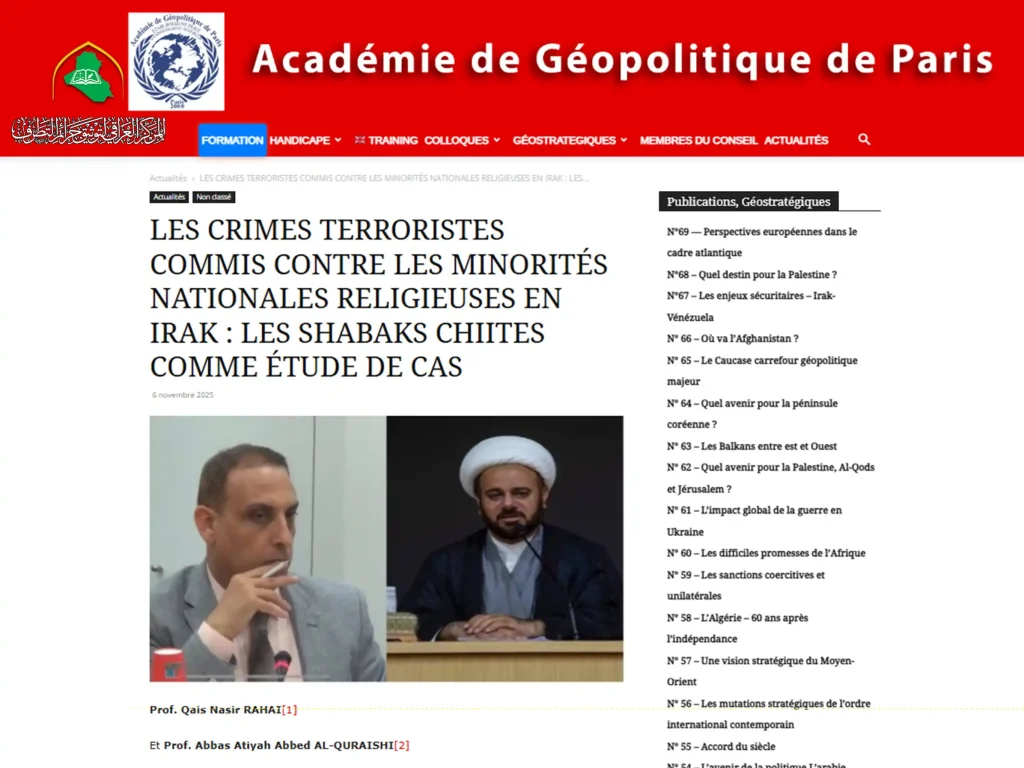 نشرت أكاديمية الجيوبولتيك في باريس بحثاً علمياً باللغة الفرنسية لفريق متخصص من المركز العراقي لتوثيق جرائم التطرف بعنوان: (جرائم الإرهاب ضد الأقليات القومية في العراق -الشبك الشيعة دراسة حالة -)، وترجمته إلى الفرنسية: (Les crimes terroristes commis contre les minorités nationales religieuses en Irak Les Shabaks Chiites comme étude de cas). وتألّف فريق البحث العلمي […]