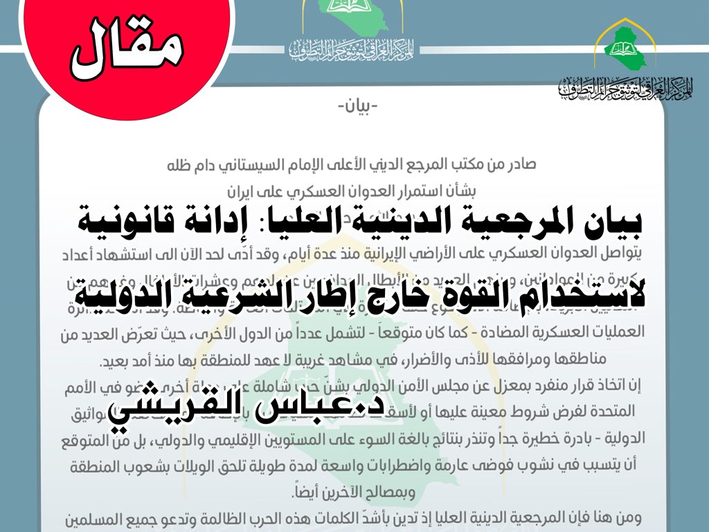 د.عباس القريشي في وقتٍ تتسارع فيه الحروب، وتُختزل فيه القوانين الدولية إلى شعارات انتقائية، يبرز بيان المرجعية الدينية العليا، الصادر عن مكتب سماحة آية الله العظمى علي الحسيني السيستاني، بوصفه موقفاً أخلاقياً وقانونياً صريحاً في إدانة العدوان (الأمريكي – الصهيوني) على الجمهورية الإسلامية الإيرانية، ومرافعة إنسانية في مواجهة منطق القوة والغلبة. فيكتسب بيان المرجعية الدينية […]