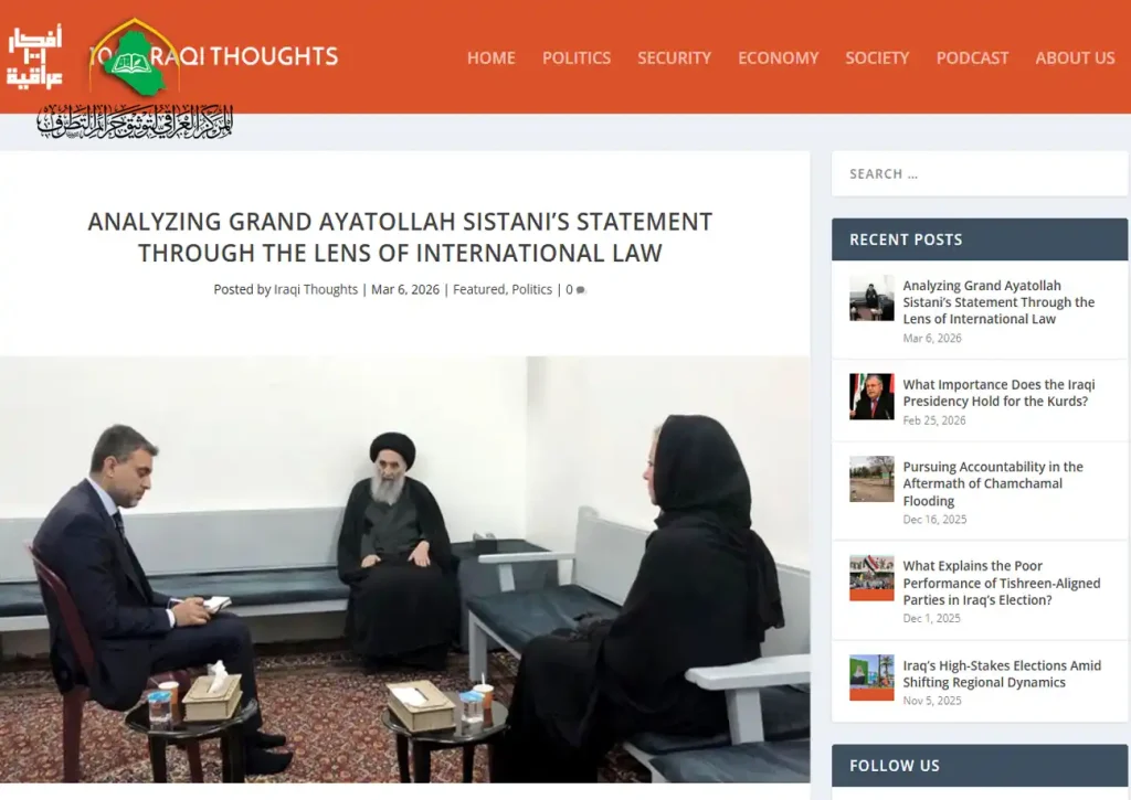 نشرت المنصة الدولية 1001 Iraqi Thoughts الناطقة باللغة الإنجليزية مقالاً تحليلياً للدكتور عباس القريشي، رئيس المركز العراقي لتوثيق جرائم التطرّف، حمل عنوان “بيان المرجعية الدينية العليا: إدانة قانونية لاستخدام القوة خارج إطار الشرعية الدولية”.