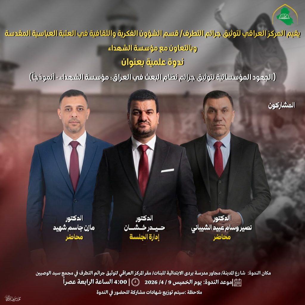 يستعدّ المركز العراقي لتوثيق جرائم التطرّف، التابع لقسم الشؤون الفكرية والثقافية في العتبة العباسية المقدسة، وبالتعاون مع مؤسسة الشهداء في محافظة النجف، لإقامة ندوة علمية متخصّصة بعنوان: (الجهود المؤسساتية لتوثيق جرائم نظام البعث في العراق: مؤسسة الشهداء انموذجا)، وذلك تزامنًا مع ذكرى سقوط نظام البعث المجرم في العراق.
